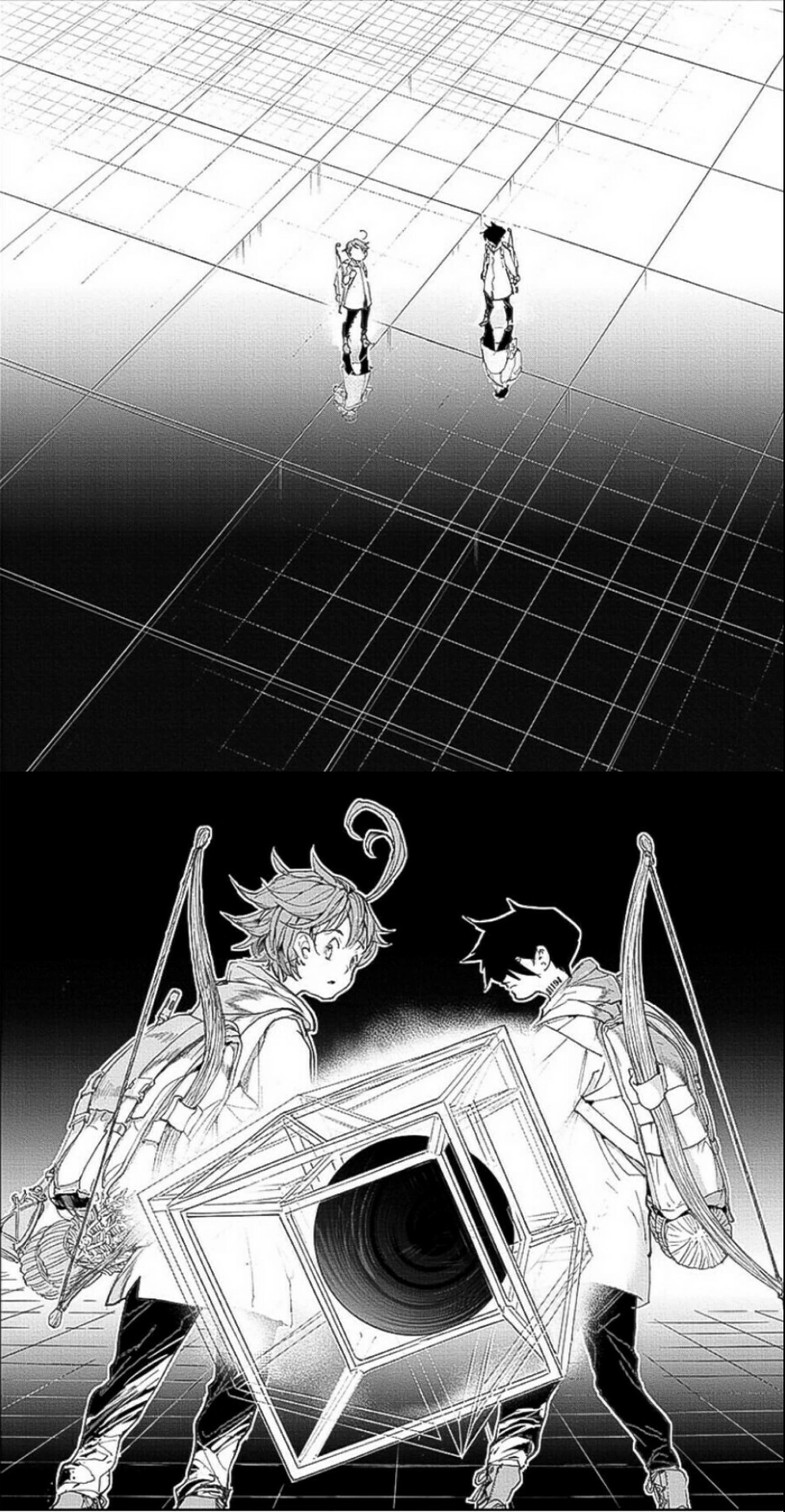 Emma and Ray, transformed into children, joined hands as they tried out Emma's theory. the sand of the desert soon rose up and disappeared, with a portion of the sand becoming the moon. The desert soon turned into a forest, and the forest soon turned into a giant cube – the true form of the location they are in. Ray started to mumble about the theory as a confused Emma watched him from behind. Before Ray could question Emma about