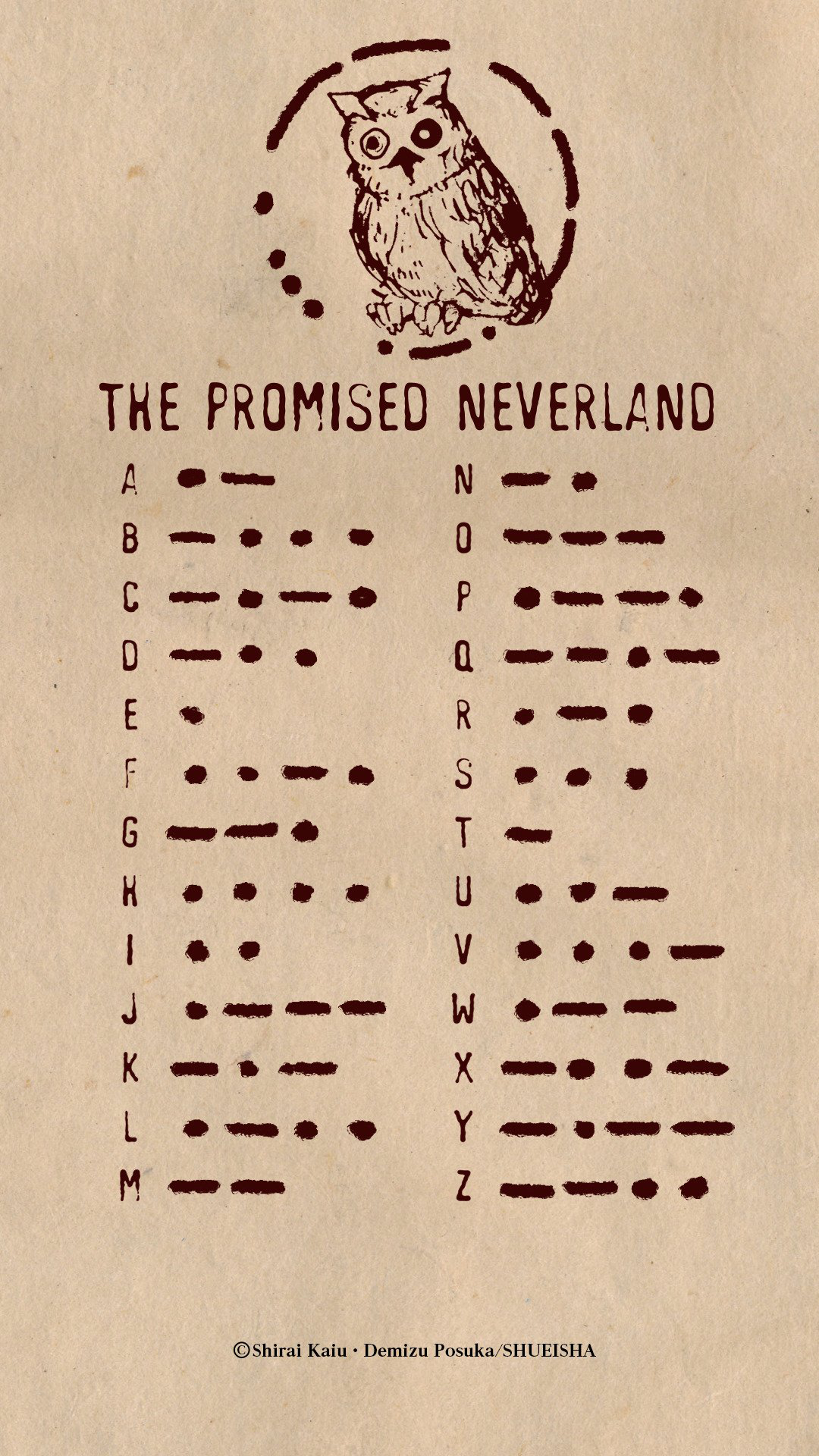 After the children escape from Grace Field, they discover that the Promised Pen has Morse code on the virtual navigation map which translates to "Touch Me". After touching the map, a box pops up with a virtual keyboard and the numbers "13-18-02". The children then realize they need to type a password into the box and that the one book from Grace Field's library that contained Minerva's owl bookplate but had no Morse code contains the password. By opening the book to page 18 and going to line 18, the second word is "Human" which turns out to be the password. After entering "Human" into the box a message from William Minerva telling the escapees to head to B06-32 is revealed.