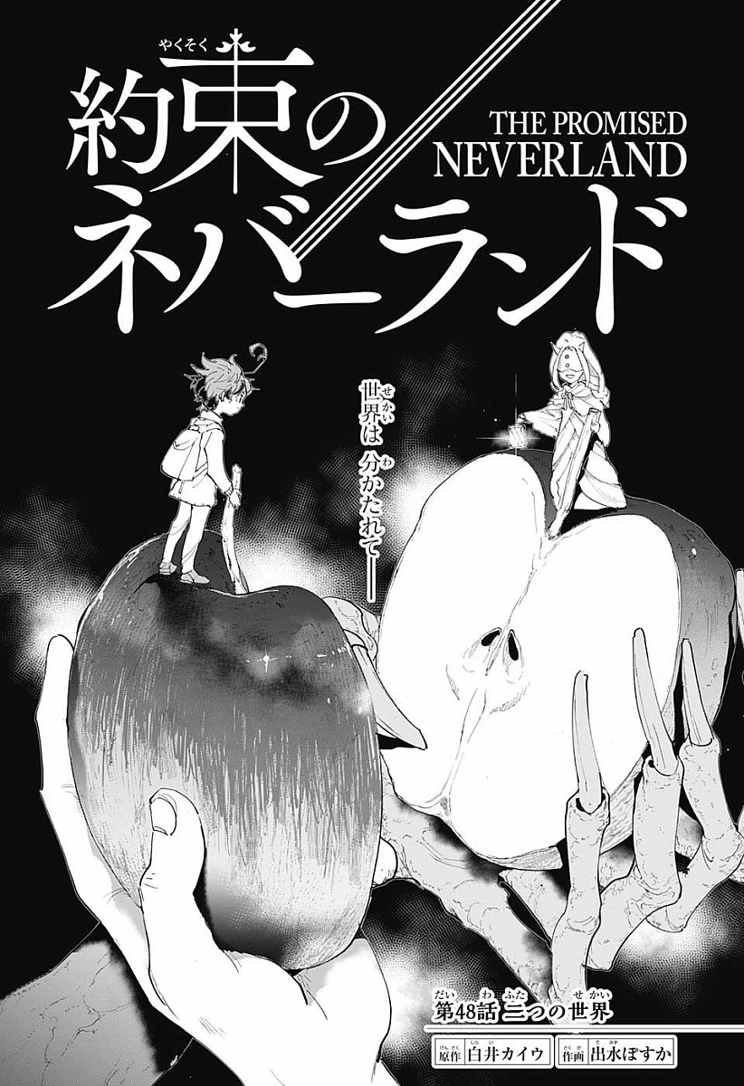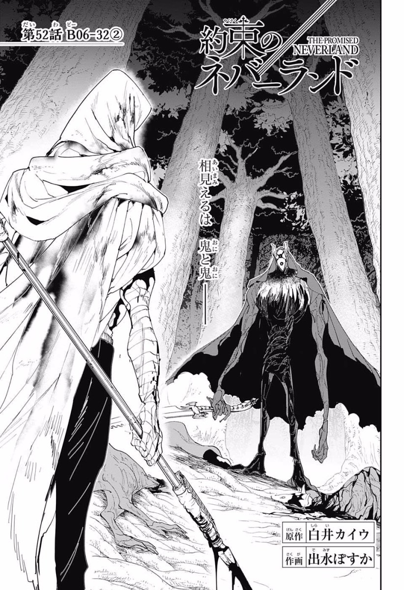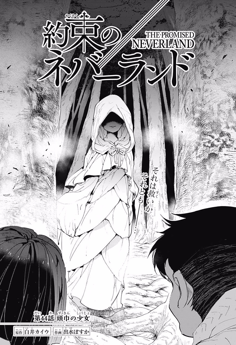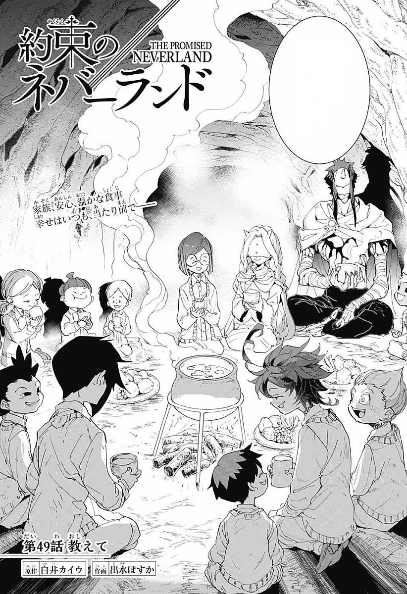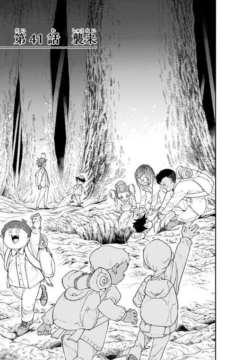 The children have successfully escaped Grace Field House, but their troubles are just beginning. Now up against a dangerous natural world and their demon pursuers, Emma and Ray struggle through a dangerous forest to lead the children to safety. When the pursuers almost catch up to them and just when the situation is at its most dire, a mysterious woman and man suddenly appear. They are revealed to be Mujika and Sonju, two demons who don't eat human meat. Despite the initial hostility, Mujika and Sonju bond with the children; teaching them survival skills, as well as revealing the truth of the world they find themselves in.