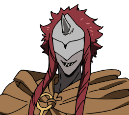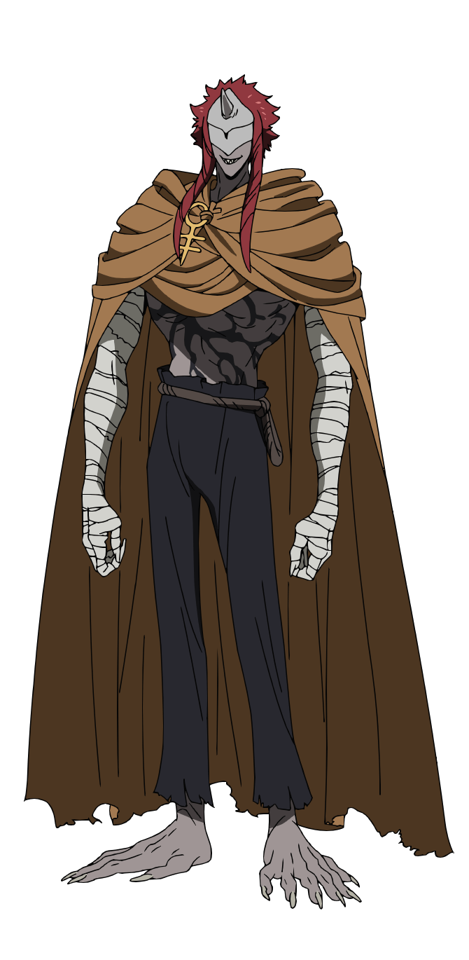 Sonju is a relatively tall and lean demon. He wears a hood and a mask that covers his entire face, which, when taken off, reveals his abnormally sharp canines. He has a horn at the center of his forehead and two polydactylie hands (six fingers per hand) that are completely bandaged. Under his hood reveals what seems to be black markings across half of his abdomen. He has short spiky dark red hair that sticks up in all directions with two long strands on each side of his face. He wears black pants secured by a belt.